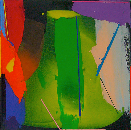 Anthony Smart: I was struck by ‘Jigjag’; it is the odd one out in the group. The rest of the paintings are predominantly vertical; this one is spatially more active in colour terms and position of the largest elements, and then these ‘biting’ thin patches of colour come in. in this painting more than the others they start to rotate spatially. The lines enforce the green in the ‘tipped’ position, or this warm blue, skewing and rotating this whole group. It is for me a much more spatial painting and I sense the success of the lines in this one. I’m very happy looking at the lines in this painting. I come to this one [‘Rasio’] and it seems more predictable; basically it’s a ‘vertical’ painting. ‘Persuader’ is the example without lines, and that proves how successful ‘Jigjag’ is. It’s quite weird and amazing what’s going on in there.