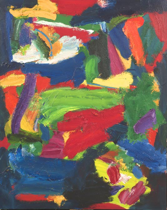 It would appear colour here is NOT used to determine the spatial positioning of the elements – certainly not in any kind of naturalistic or atmospheric way; blues do not recede, nor reds come forward (if they ever did – Gouk has said to me reds always recede), nor is there much in the way of “push-pull” backwards and forwards, in and out of the picture plane, as per Hofmann (or indeed, Hilde’s work from Brancaster 3). I’m not sure there is a sense of a picture plane at all, even when there is a “surround”. The colour in these later Pollocks is not only (excitingly) ambiguous as to its spatial positioning, but seems to act primarily as a differentiating device, to confirm one thing in relation to (on top of?), but separate from, another. The colour, of itself, is certainly not “nuanced”, as, say, in the work of a painter like John McLean (though I would agree with Tony that it is “tuned-up”; but only perhaps to further differentiate, without causing a complete disconnection or disruption – still keeping it “solid”, as Fred says). Maybe what I am suggesting is that the colour in Fred’s newer work is more abstract…? But it also seems more akin to the differentiation of parts in abstract sculpture – one thing, one piece of “stuff” AGAINST another piece of “stuff”, of different size and orientation, turning and acting in space, acting upon each other; but decisively not in a DEPICTION of space. I think this might be good, even though I’m not sure I like the paintings…!
