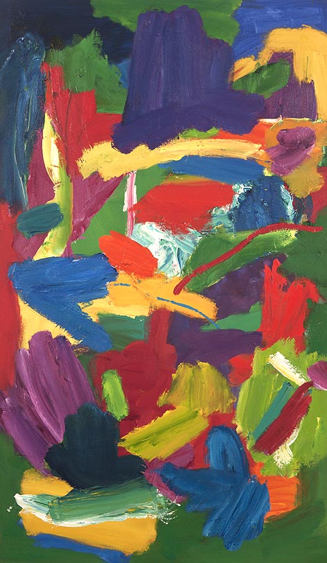 Anthony Smart: Isn’t it that the red is more red, the blue more blue? You are particularising the redness; it’s not red just out of a tube. Abstract painting, abstract sculpture, have to have a reality, create their own reality and these reds are particularised by their shape, by their interference, and they become more red than just red. They become that very special red which sits with that very special ‘tuned-up’ green, so what you are seeing is the integration of colour, shape, texture, torn edges etc, the whole panoply of what you could do with paint and the tools you put it on with. You see the whole thing ‘tuned-up’, all in the name of colour.