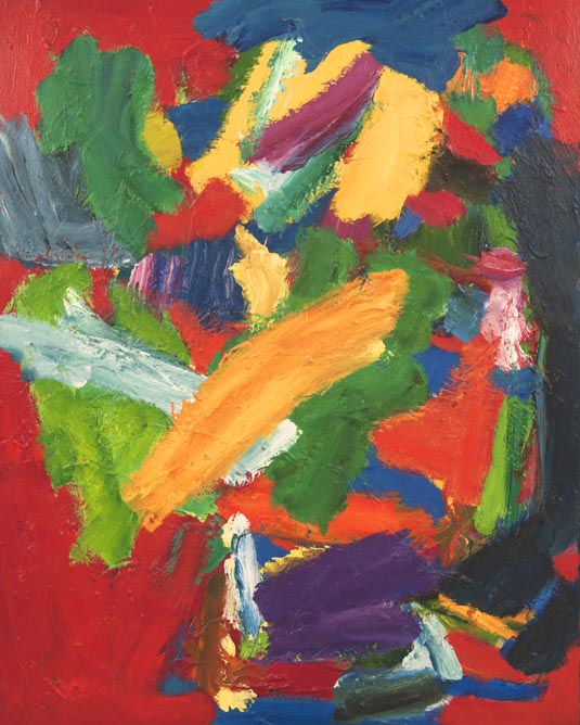 Fred Pollock: Yes, yes. As the painting developed I realized that if I made more of this red it would help what’s in the centre to hold together better, isolate all of these different parts and make them just hold together, so that you feel that you can’t move anything without destroying the picture. There is nothing there that I feel I could take out, it needs that yellow in the middle there which helps to keep the rest of it working in the way that it is working.