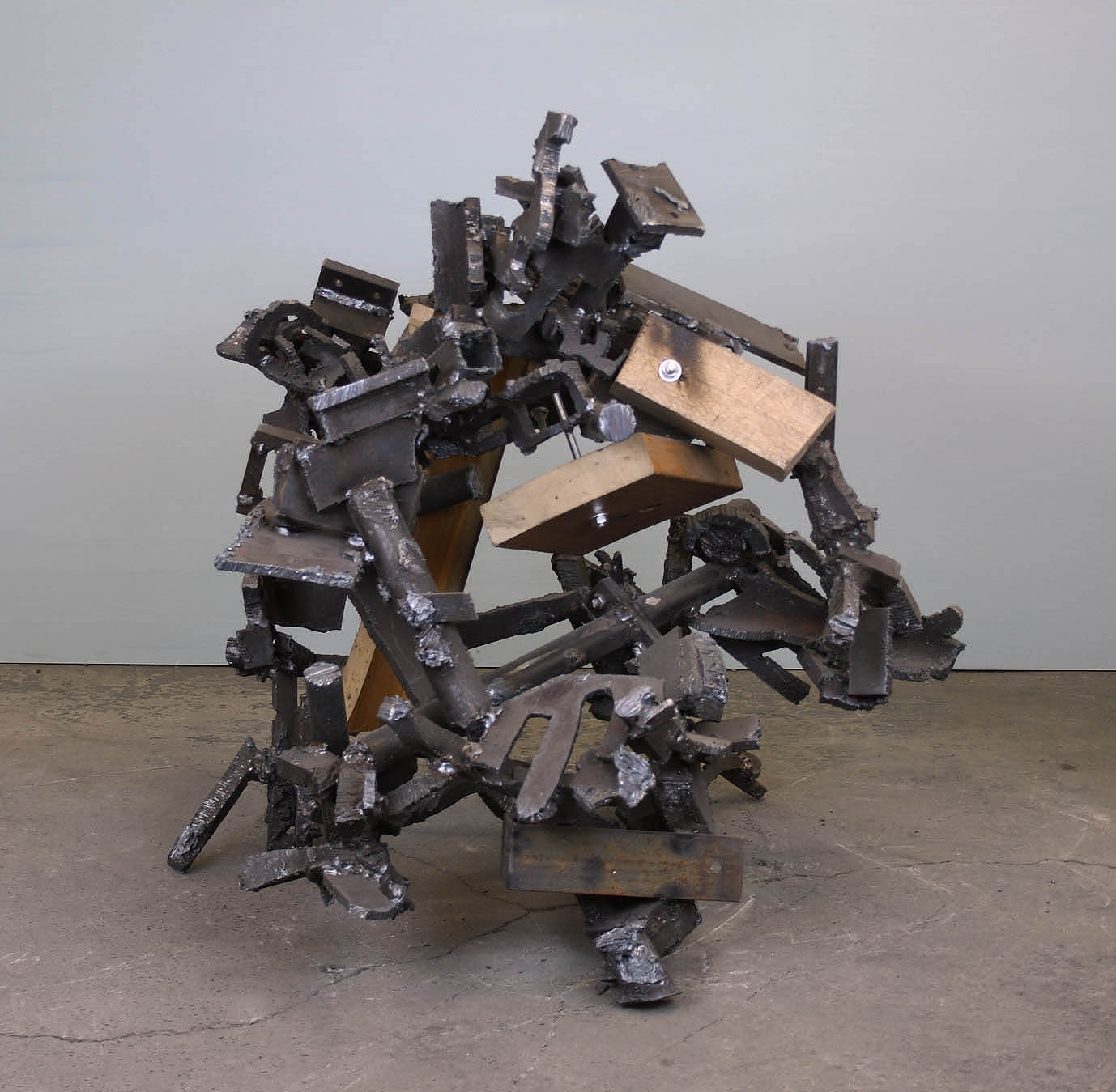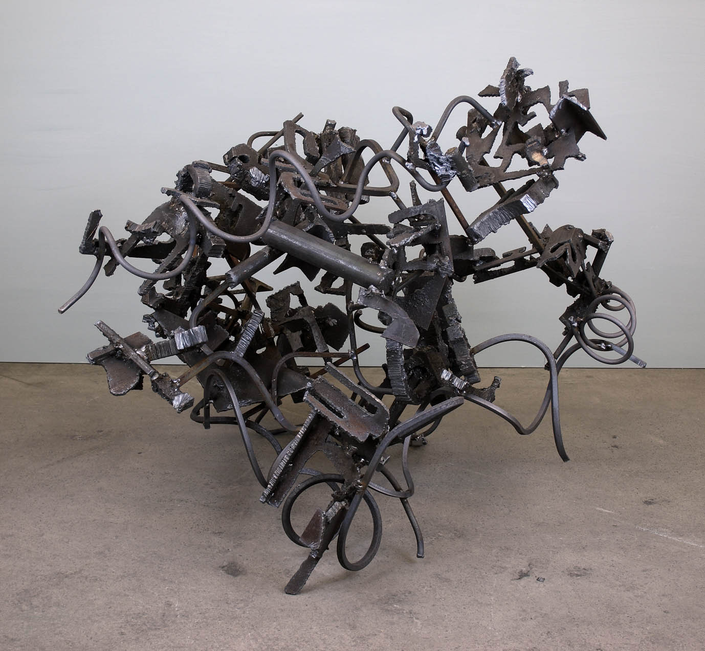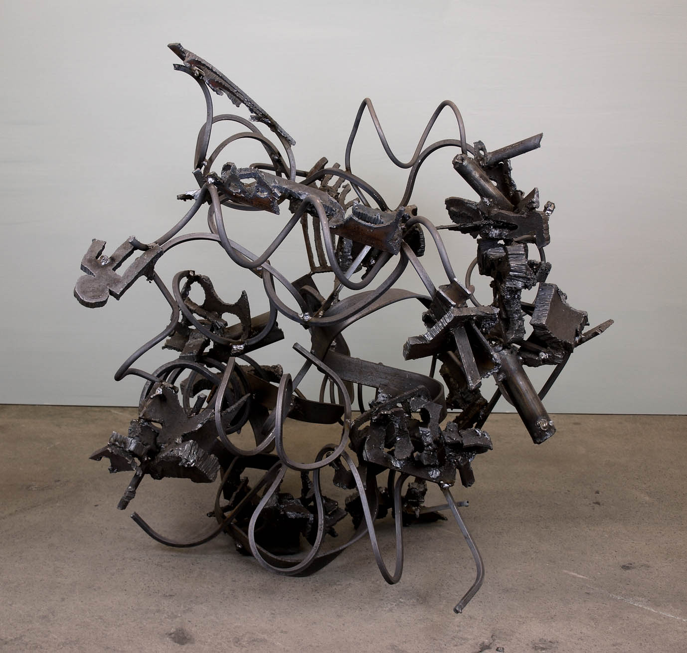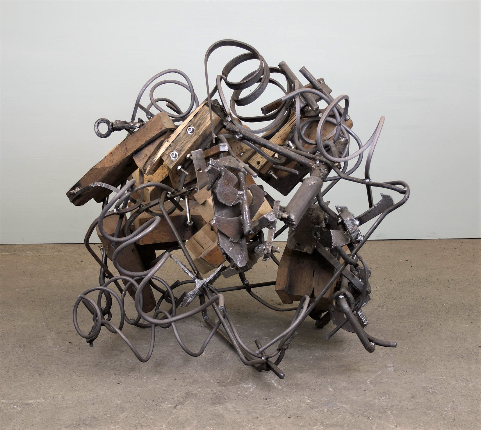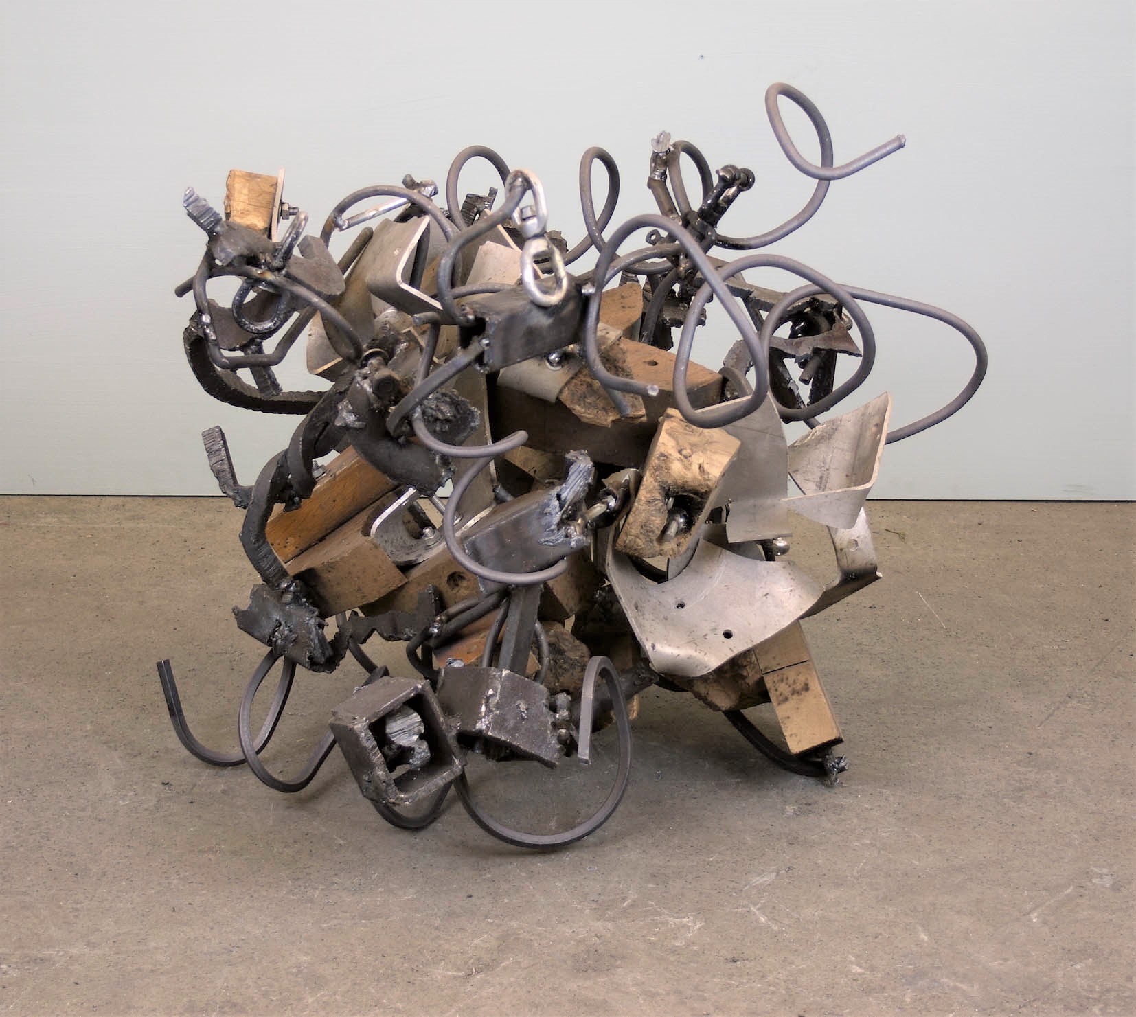 Here is something of my experience this past two weeks that I though was different and special. I have not had many visitors to the show since the Brancaster talk (I wouldn’t have expected many anyway), but there have been a handful of people who have applied a great deal of time and effort and close and concentrated looking to their visits here, especially when addressing the sculpture (though the paintings also got some good attention). Thanks to them all. What particularly interested me was the method of looking at individual sculptures that one of my visitors demonstrated. I won’t mention names – they can comment if they so wish – but this particular person spent long and careful minutes (a total of about two and a half hours altogether!) looking at each of the sculptures in turn, and in a manner that I have not really seen happen before. His approach was actually not completely dissimilar to the way Tony, Mark and others looked at the work in Brancaster, but this seemed to have in some way an even greater focus and a different approach. Each sculpture was addressed from several directions in turn, often very close-by (sometimes from a distance too) and often looking almost directly down at the work, with head and body in movement, sideways, backwords, forwards etc., with the viewer’s legs positioned close to the work, but flexed to accommodate movement of the upper body in order to see everything from different directions; then the viewpoint was shifted around a little, looked at again, and seen together differently, as all the parts in all their complexity began building into a thing that operated as (what I hope is, at least in some cases) a fully three-dimensional whole. (Note: no fixed viewpoints or any kind of frontal images dominate the work! Also, the sculptures do more than just travel from A to B along an extended length of material which ultimately comes to an end, physically or not. In these works, parts circulate back and forth in as varied a manner as possible. It seems to me possible to engage this way with a much more extensive three-dimensionality than figurative or semi-abstract organisational structures have used, including my own previous work.) Not only was this way of looking at my sculpture fascinating for me to watch happening – the way that someone else might take hold of the work in this way, differently and personally, in a manner that felt almost more intense that my own making/looking (and certainly seeing things I haven’t seen!)… But there was also a strong and obvious enjoyment in looking at the work in this way, the acknowledgement of a certain degree of coherent togetherness in the intimacy of all the widespread varieties of complexity, as it occurred; and this was even sometimes demonstrated by the appearance of a smile of “recognition” of what was happening in the “deep” content of the work, connected with something very different from what is often seen in sculpture – perhaps a new and particularly personal way of addressing the true “abstract” of sculpture. As you can see, I’m totally in love with the possibilities of this approach.