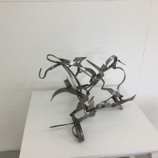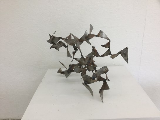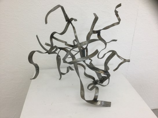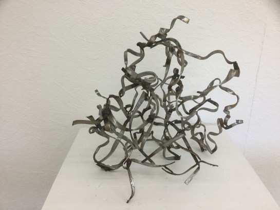 In Tony’s sculptures I feel the indeterminacy is all in the movement, the more I think of them the more I am impressed by the changes and flowing ‘kineticness’ of the works. The movement has a different quality to Mark’s complex, fragmented, cutting, shifting expressions, but there is a connection. It feels to me that the movement in Robin’s sculptures comes from the complexity of the elements within each piece.