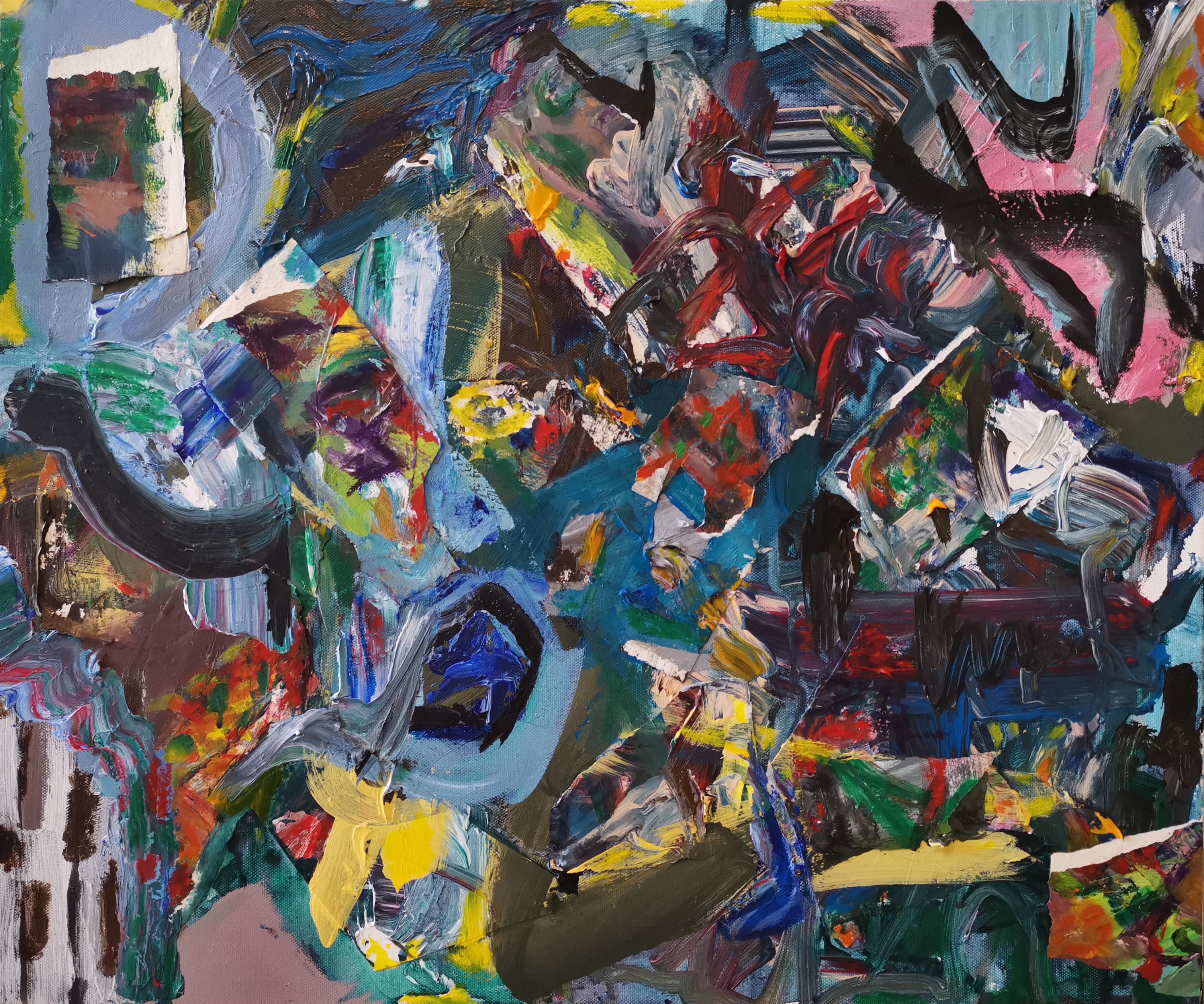 Of the non-collage paintings, my favourites are ‘Tempered Grace’ and ‘Hid Dud’. I enjoy the scraping that creates veil like layers of depth, kept in check with the surface I think, simply by the colour and the deft touches of black cutting in and out of the space. The multi directional movement within them is really good too, perhaps more open and from the shoulder than the more drawn gestures in ‘Insignia of Lockdown’ and ‘Escaping Me’? Although admittedly, these latter two are rather large works and would need to be seen in the flesh before committing to a judgement of them. Perhaps the scale of the gestures are quite similar across the works? Perhaps I’m responding well to the internal scale of ‘Hid Dud’ and ‘Tempered Grace’.