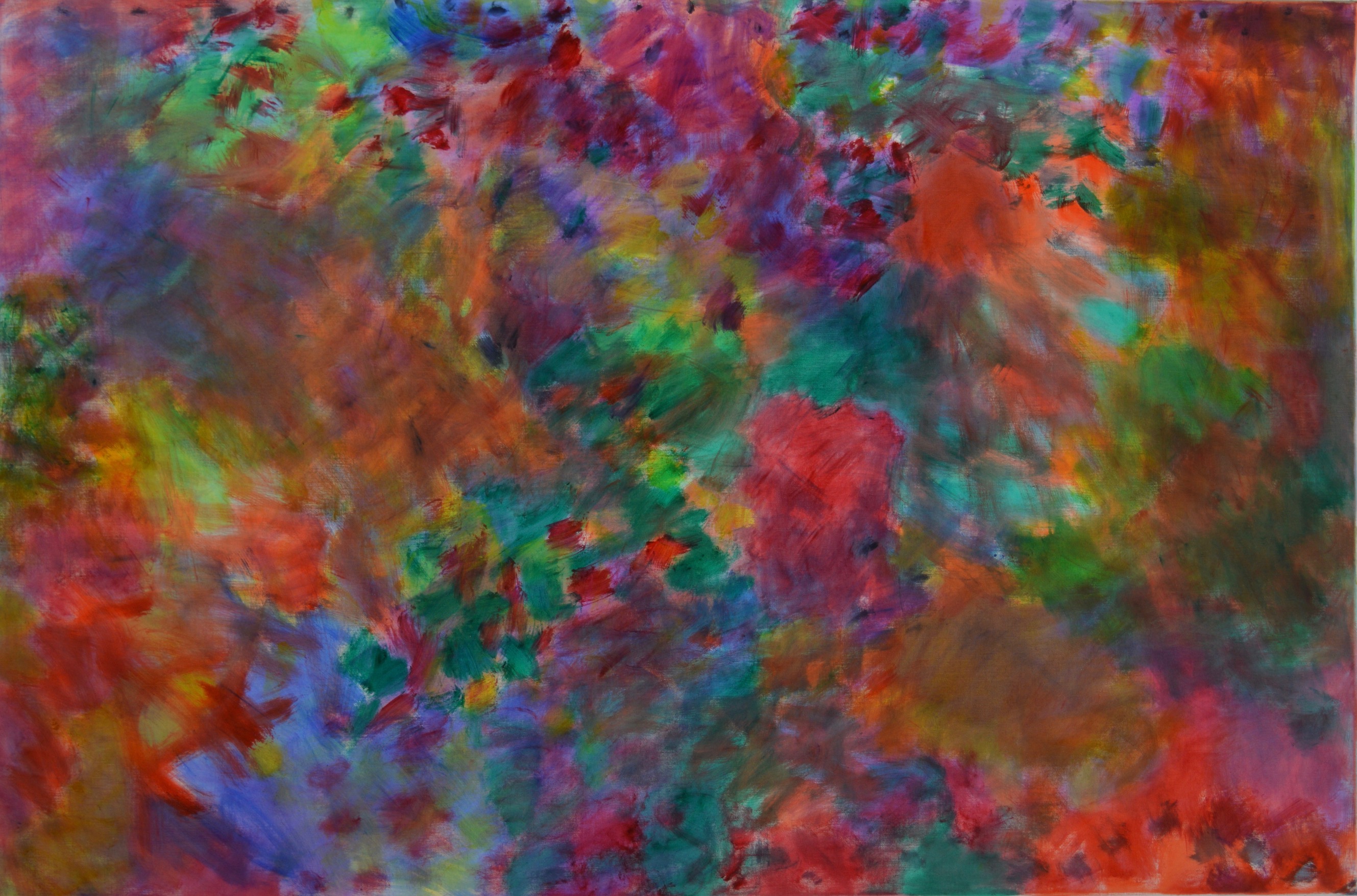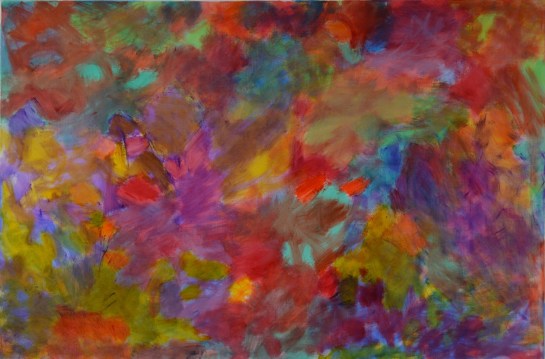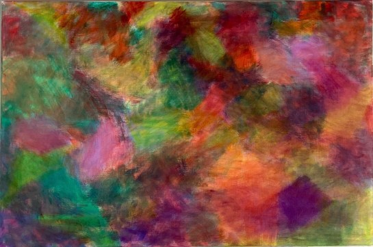 I have been able to view these paintings several times over the last few weeks and have been struck by Hilde’s use of colour to generate expression. The colour emerges from within the painting, rather than on top of the canvas. The paint is not so much on the surface but inside the surface. The varying densities created by veils of different colour; no colour completely disappears beneath another, but adds to the increasing density with blues and reds pushed out, emerging into the light, up to the surface, as in Drumming Drone. This fluid, gentle relationality creates in indeterminate and slightly unsettling visual environment.